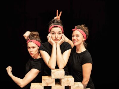 Drei Frauen spielen ein kabarettistisches Stück über Sisyphos und den bürokratischen Wahnsinn mit Sprache, Rhythmus und Bewegung.