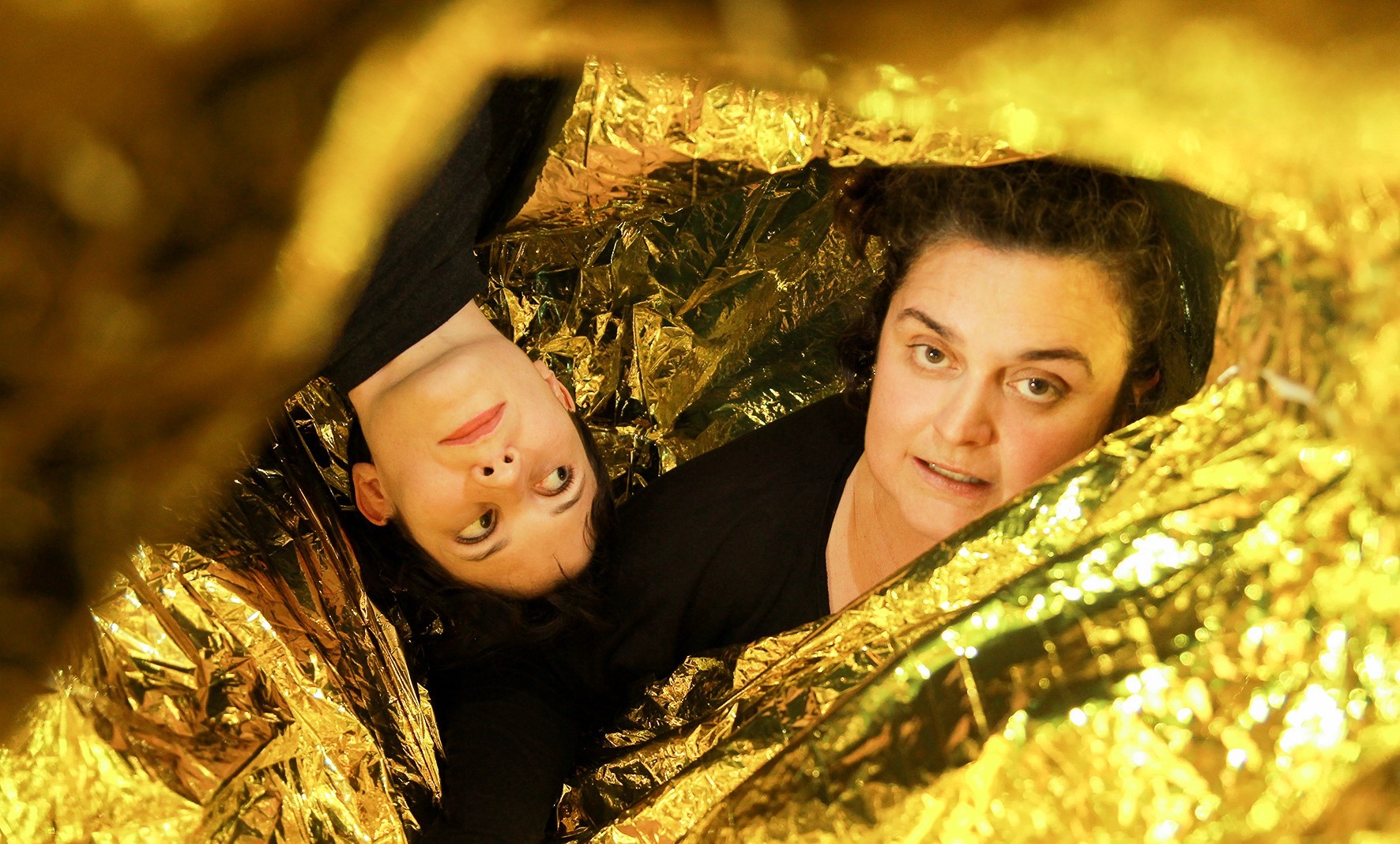 Dieses Kaleidoskop bringen zwei schauspielende und tanzende Darstellerinnen sowie ein Musiker mit Humor, Feingefühl und Fatalismus auf die Tatsache der Bühnenbretter. Auf ihrem Weg durch den Irrgarten verstricken sie sich in die Fragen und Nöte, die sich bei der Spiegelung ihrer Wirklichkeit ergeben.