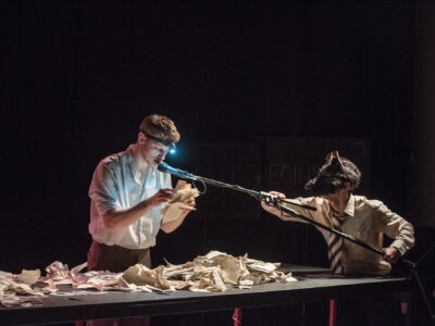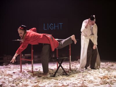 Begleitet von Livemusik entwickeln fünf Darsteller und Darstellerinnen ein ironisches, körperliches, herausforderndes, visuelles Spektakel, das die heutige Welt in ihrer ganzen Schönheit, ihrem Horror und ihrer Komplexität zu beschreiben versucht. Mit einem Delirium von Bildern, Szenen und Ereignissen nimmt die Rotes Velo Kompanie einmal mehr die Auflösung der Grenzen zwischen Musik, Tanz, Theater und bildender Kunst für sich in Anspruch. Das Stück untersucht, wie wir von der Sprache geformt und eingeschränkt werden. Wir begegnen – in Wort, Bewegung, Tanz und Klang – Begriffen wie: Identität, Feind, Toleranz, Atem, Stille, Intimität, Eros, Erosion… Dabei entsteht eine Collage aus faszinierenden Bildern in einem anarchischen, aber stark poetischen Performance-Stil.