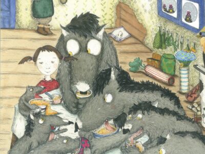 «Suppe, satt, es war einmal…» von Kristina Andres: Mathilda ist ganz allein zu Hause, als die hungrigen Wölfe wütend gegen die Tür schlagen und hereinwollen. Da fallen dem Mädchen die mächtigsten Worte ein, die sie kennt: Suppe, satt, es war einmal. Denn nur so kann man wilde Wölfe zähmen.