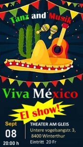 Zum Programmarchiv Fremdveranstaltungen Do. 08.09.22 20.00 Uhr CHF 20 Company Agua Azul Viva Mexico el show Viva México – el show Ist eine Reise durch die mexikanische Kultur. Vom Tanz der Azteken bis zur traditionellen Musik der Mariachi. Wir feiern den National Monat September. !Viva México!